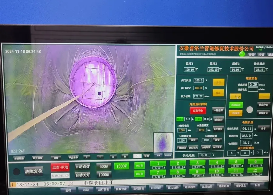 The pipe to be repaired this time had a single section of 100 meters and a curing time of up to 7 hours, which required high equipment performance and stability; And it was made of DN1950 large pipe diameter and 15mm large wall thickness UV-CIPP liners, requiring the assistance of Pro-liner UV Curing system with a curing power of 2 * 6 * 1500W.