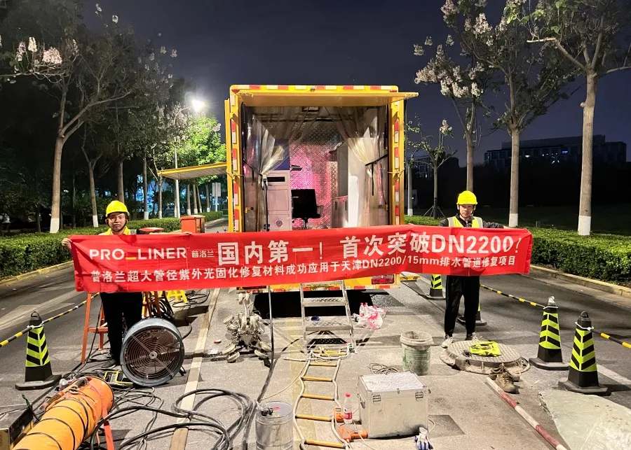 Pro-liner DN2200 UV-CIPP liner was specially designed for rehabilitation extra-large diameter pipes, with a liner thickness of 15mm and a corrosion-resistant service life of more than 50 years. Its flexibility was suitable for variable diameter pipes, successfully solving the problems of liner deformation and adhesion for DN2200 diameter pipes, and filling the gap in domestic rehabilitation liners for pipes with diameters above DN2000.
